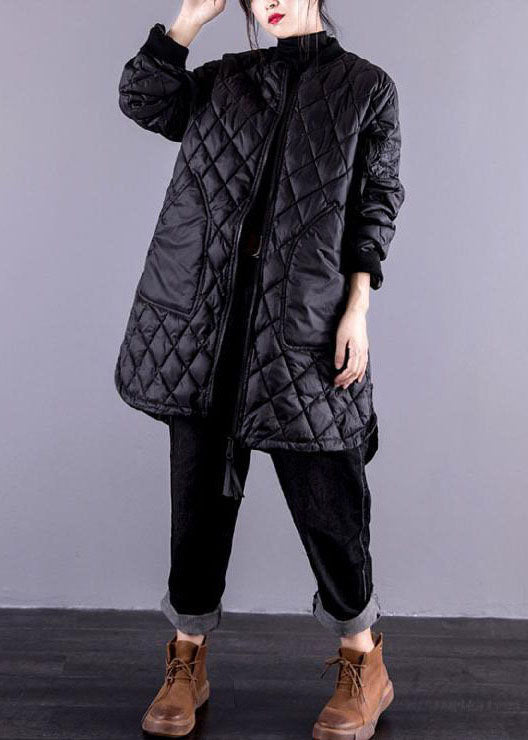 Elegant Black Stand Collar Zip Up Pockets Fine Cotton Filled Coats Winter