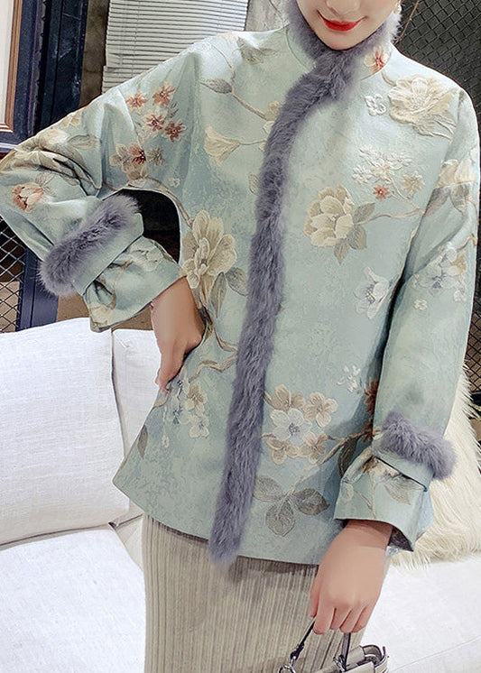 Elegant Blue Fur Collar Embroideried Warm Fleece Parka Winter