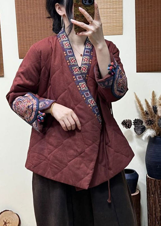 Elegant Rust Embroideried Patchwork Lace Up Fine Cotton Filled Coats Winter