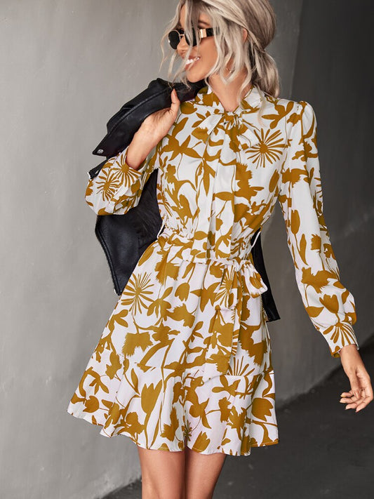 Fall Outfits Women Spring New Long-sleeved Crewneck Dress Lace-up Waist Short Skirt Temperament Commuter Women's Wear Dresses