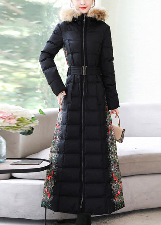 Fine Black Fur Collar Zippered Sashes Warm Thick Long Hooded Parka Winter