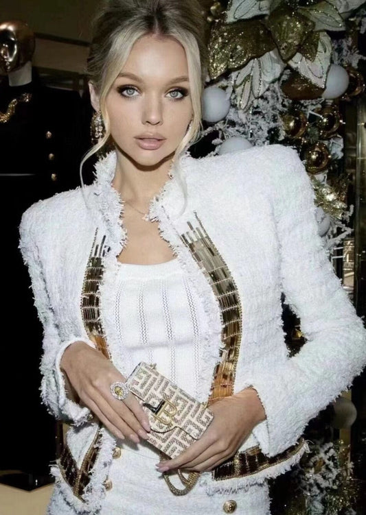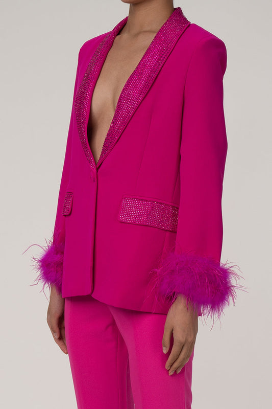 Glittering Rhinestone Shawl Collar Feather Trim Cinch Waist Party Blazer