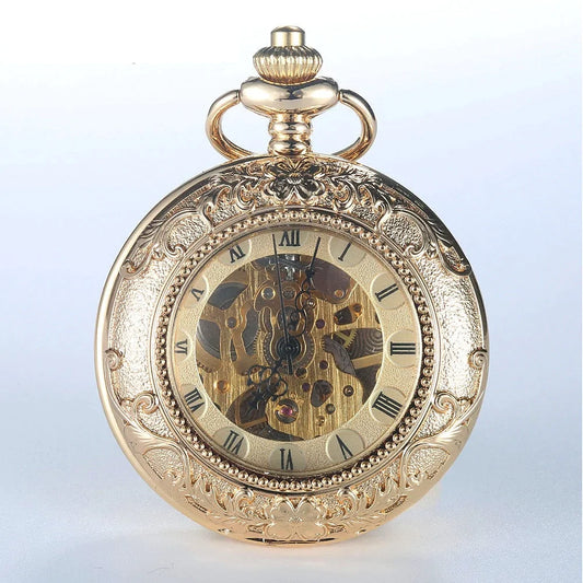 Gold Steel Carving 2 Sides Open Case Roman Dial Mechanical Pocket Watch