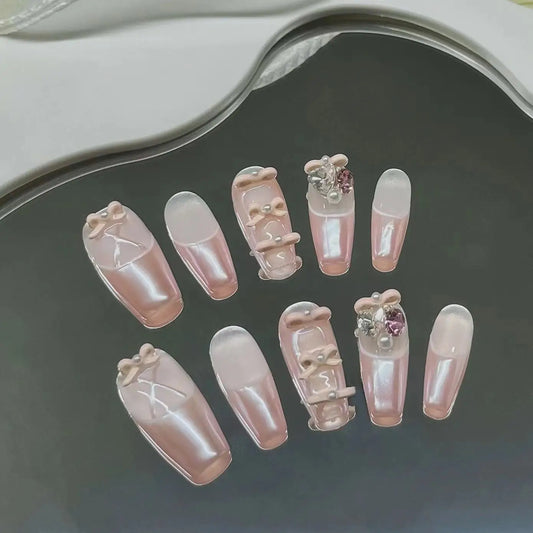 Handmade Pink Nails Set Press on Cute Korean Medium-length Artifical Nails Full Cover Nail Tips with Design Adhesive False Nails