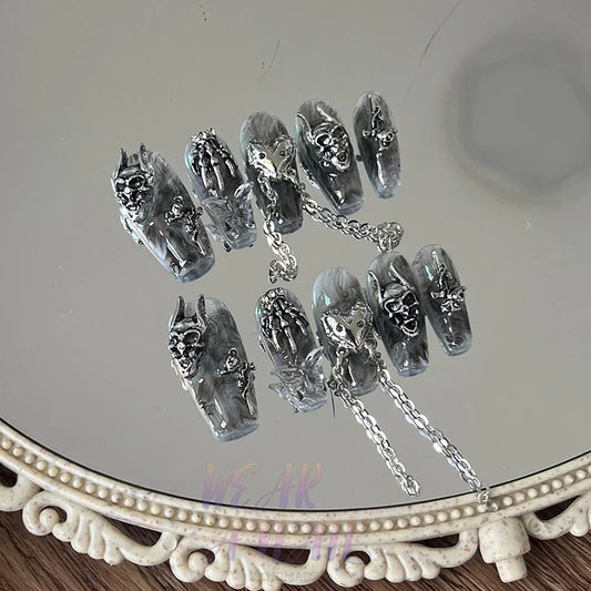 Handmade Press on Nails Black Dark Gothic Wearable False Nails Rhinestones Demon Decoration Reusable Charm Acrylic Nail Tips