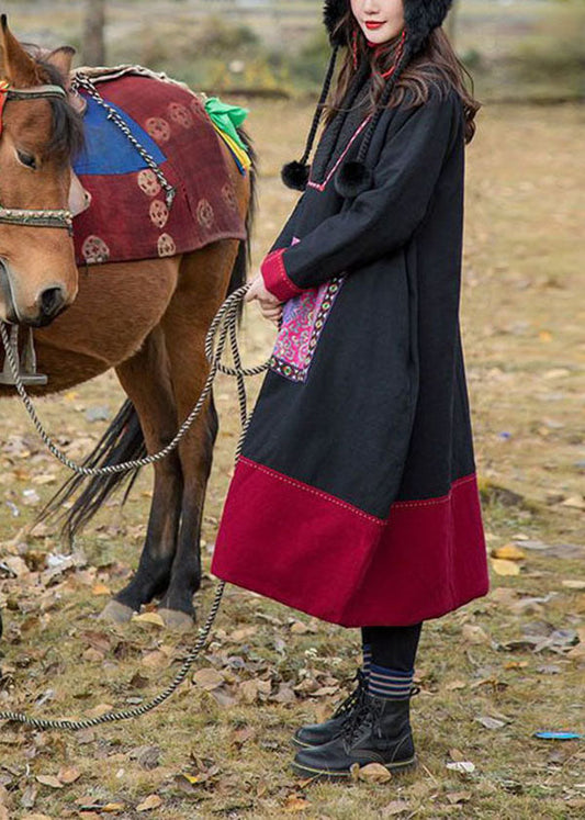 Handmade Black V Neck Patchwork Embroideried Fine Cotton Filled Gown Winter
