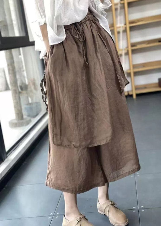 Handmade Coffee Elastic Waist Drawstring Asymmetrical Linen Wide Leg Pants Summer