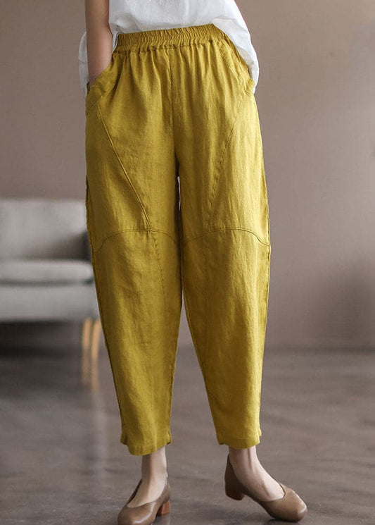 Italian Yellow Elastic Waist Pockets Linen Pants Summer