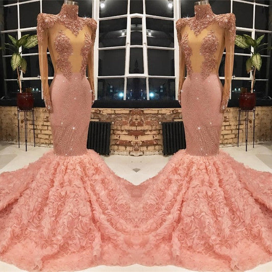 Long Sleeves Pink Prom Dress Mermaid Appliques With Flowers Bottom