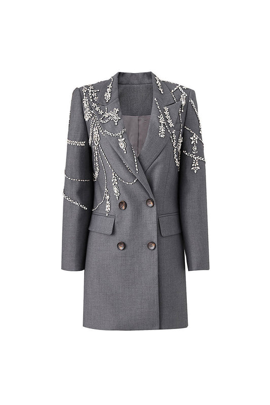Luxury Crystal Lapel Shoulder Pad Long Sleeve Double Breasted Crepe Blazer