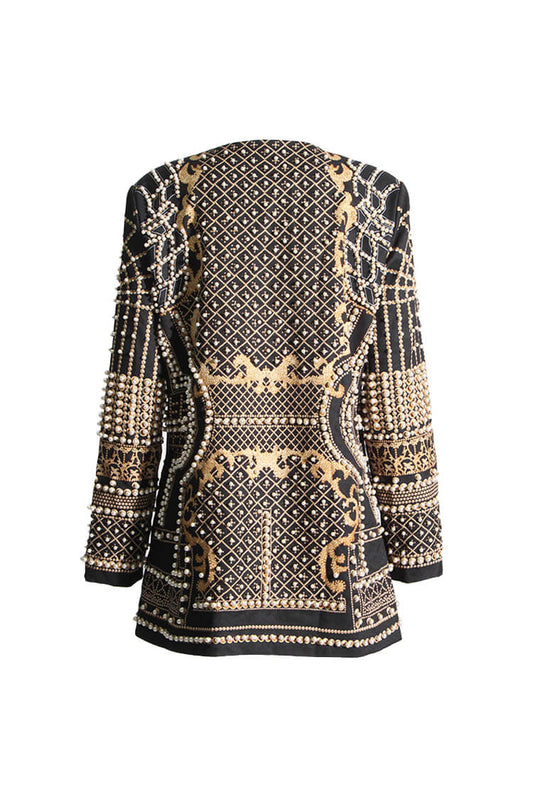 Luxury Faux Pearl Embellished Printed Plunge Shoulder Pad Party Blazer