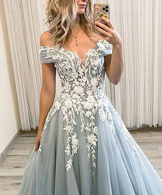 Maci | A-Line Tulle Applique Off-the-Shoulder Sleeveless Sweep/Brush Train Dresses