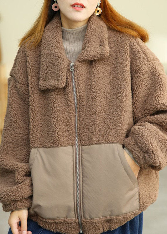 Modern Khaki Peter Pan Collar Patchwork Pockets Teddy Faux Fur Puffers Jackets Winter