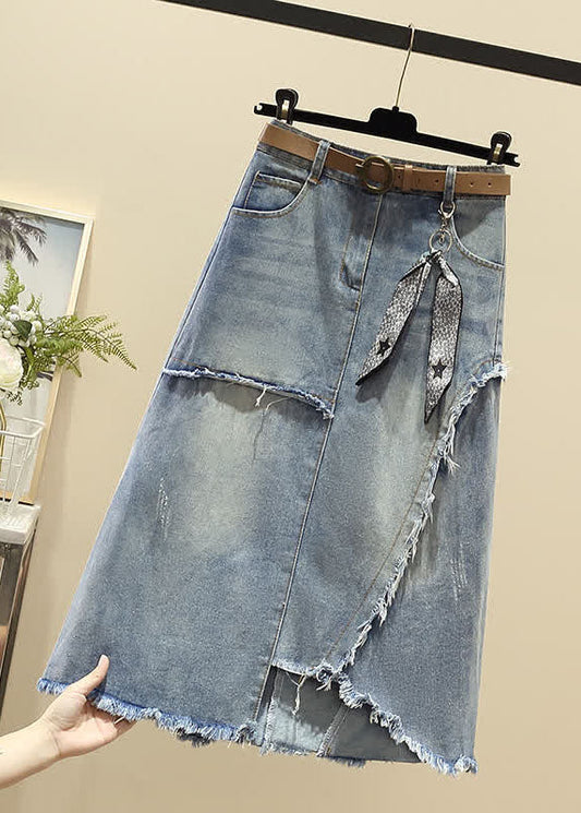 Modern Light Blue High Waist Asymmetrical Sashes Pendant Pockets Cotton Denim Skirt Summer