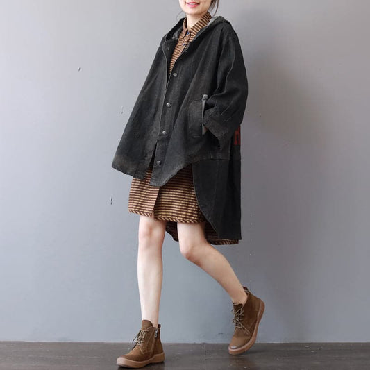 New dark gray denim coats trendy plus size hooded trench coat fine low high design coat