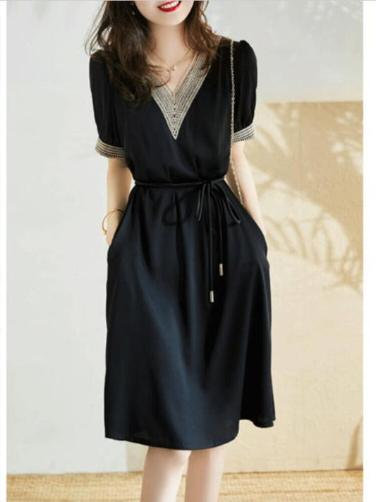 New Summer Elegant Dress V-neck Openwork Embroidered Lace Waist Slim Women's Commuter Casual Wear Dresses for Women Embroidery