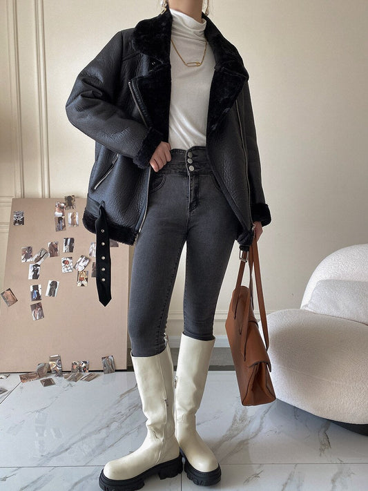 New Women's Warm Thickened Jacket Medium Long Motorcycle Coat Handsome High end Leather Jacket Lamb Hair