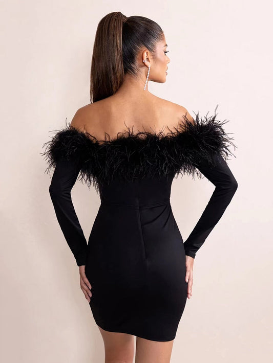 Off the Shoulder Black Sequins Short Homecoming Dress with Feathers
