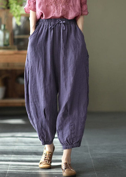 Purple Solid Linen Beam Pants Elastic Waist Wrinkled Summer