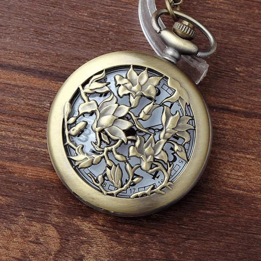 Retro Vintage Unisex Bronze Hollow Flower Pocket Watch with Necklace Chain