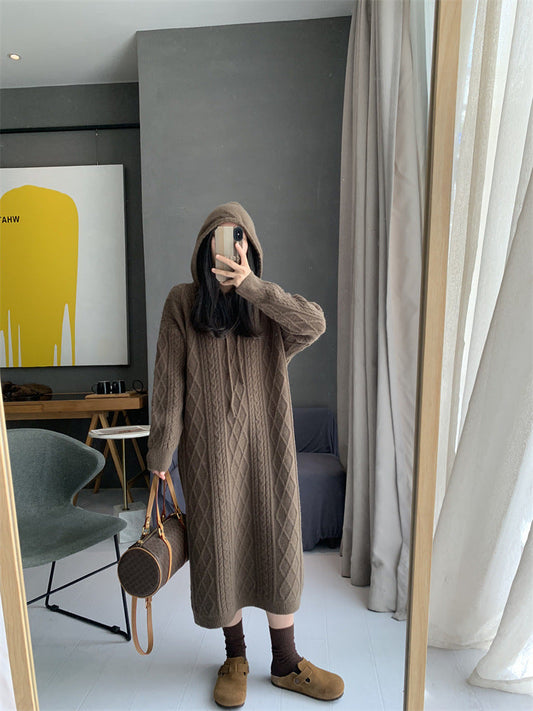 Retro-Style Hooded Solid Color Sweater Dress: Mid-Length 2023 Fall-Winter Women's Vintage Dress