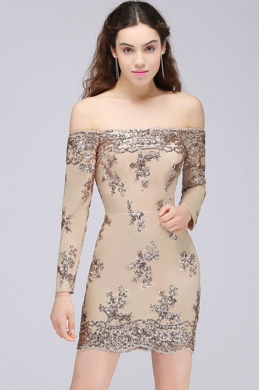 Sheath Off-the-Shoulder Nude Pink Homecoming Dresses with Sequins