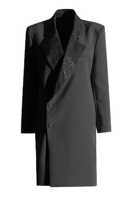 Sparkly Lapel Padded Long Sleeve Button Down Rhinestone Long Blazer