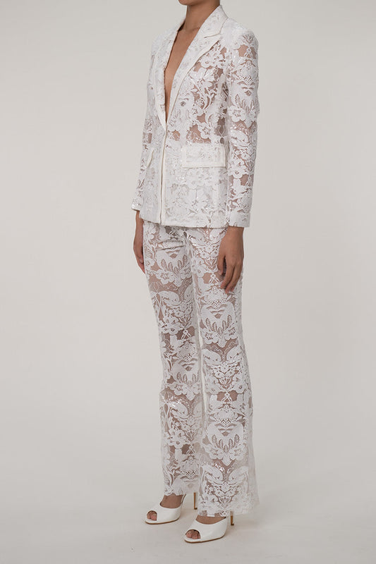 Sparkly Sequin Floral Embroidered Flared Pants Two Piece Sheer Blazer Set
