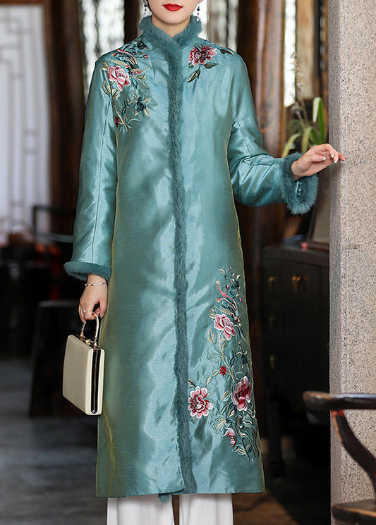 Stylish Apricot Faux Fur Collar Embroideried Floral Thick Satin Cheongsam Long Sleeve