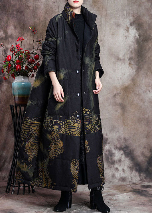 Stylish Black Stand Collar Oversized Print Pockets Fine Cotton Filled Puffer Wool Coats Winter