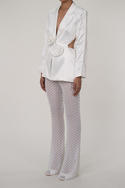 Sumptuous Beaded Cut Out Sheer Sequin Pant Two Piece Rosette Blazer Set