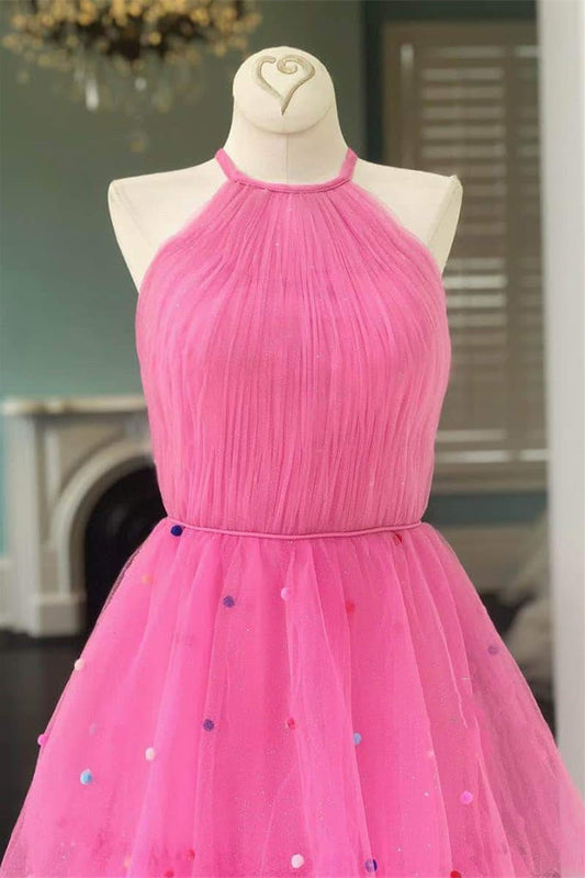Tessa | Hot Pink A-Line Tulle Prom Dress with Colorful Dots