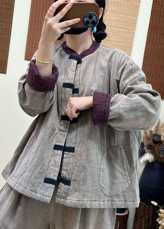Vintage Light Grey Stand Collar Patchwork Pockets Fine Cotton Filled Coat Winter