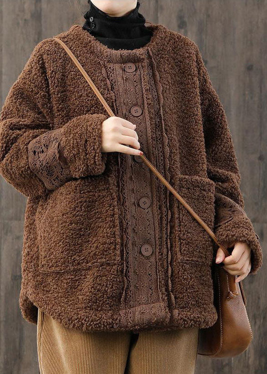 Women Light Blue O-Neck Oversized Lace Patchwork Teddy Faux Fur Coats Winter