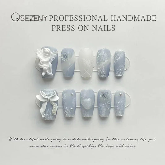 10Pcs Blue Handmade Press On Nails Set Ballet Wearable Artificial False Nails Decoration Nail Art Manicure Fake Nails Tips Art