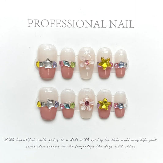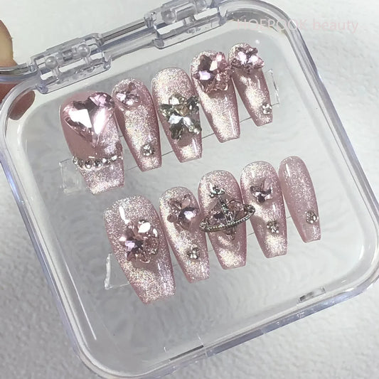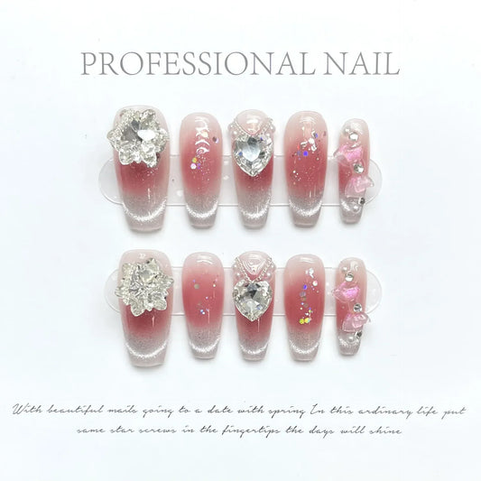 10Pcs Sweet Pink Handmade Press On Nails Ballerina Japanise with Rhinestones Wearable False Nails Decoration Fake Nails Tips Art