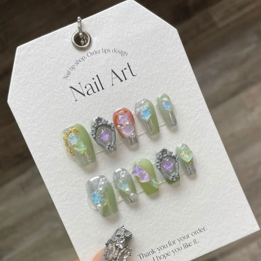 10Pcs Set Frozen Butterfly Handmade Press On Nails False Nails Decoration with Rhinestones Manicure Fake Nails Tips Art Wearable