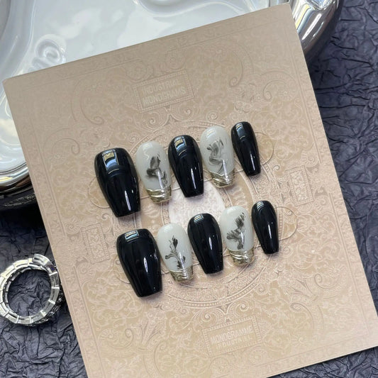 10Pcs Shiny Handmade Press On Nails Short Ballerina Artificial Full Cover Cat Eye Rose Design Fake Nails Wearable Manicure Nails