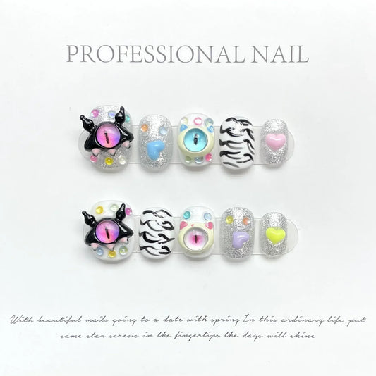 10Pcs Handmade Press On Nails with Eye Little Monster Design Wearable Manicure False Nails Decoration Full Cover Nail Tips Art