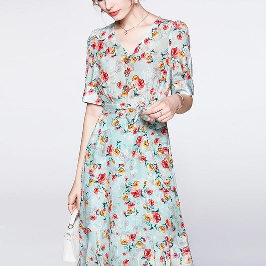 2022 Summer Single Breasted Dress Comfortable Printed V-neckline Dress Fashion Temperament Commuter Women's Wear Dresses Women