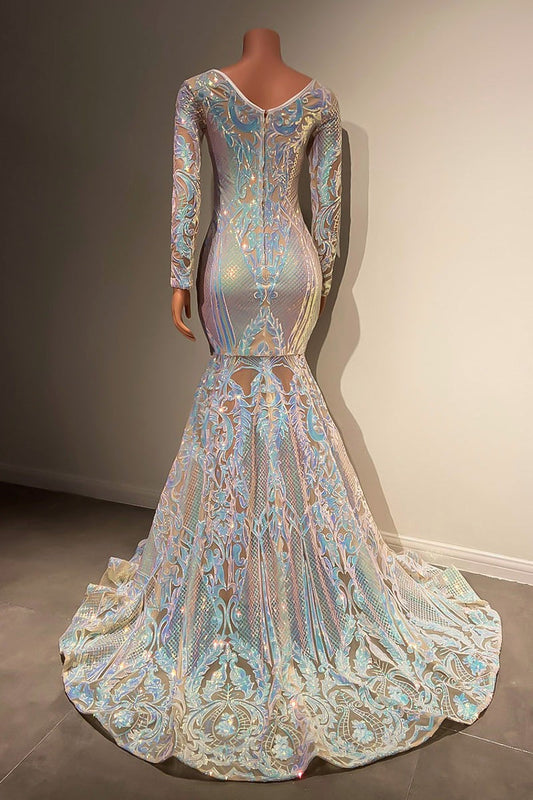 Beautiful Long Mermaid White V-neck Lace Glitter Prom Dresses With Long Sleeves