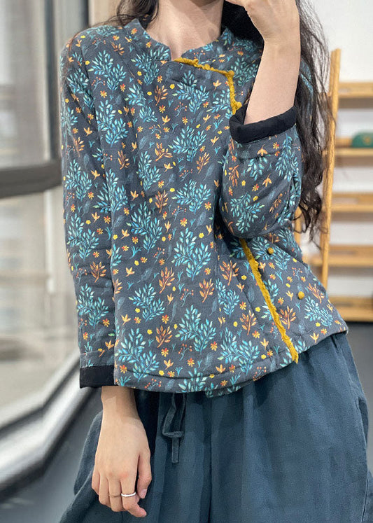 Blue Print Fine Cotton Filled Parkas Stand Collar Winter