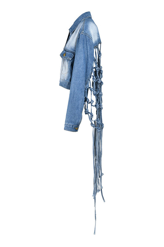 Boho Chic Button Down High Low Cutout Macrame Fringe Crop Denim Jacket