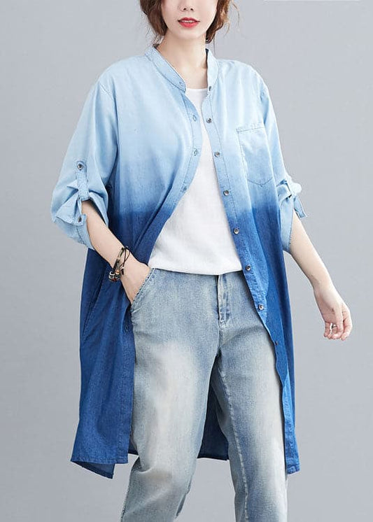 Boho Blue Pockets Button Gradient color Fall Denim Trench Long sleeve