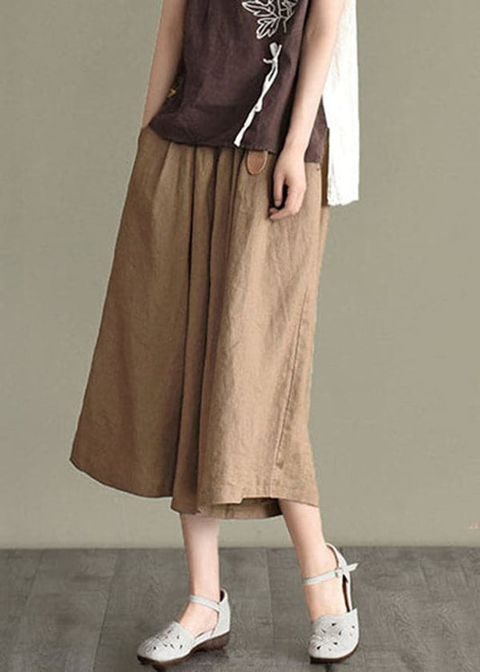 Boho Khaki Elastic Waist Oversized Pockets Linen Wide Leg Crop Pants Summer