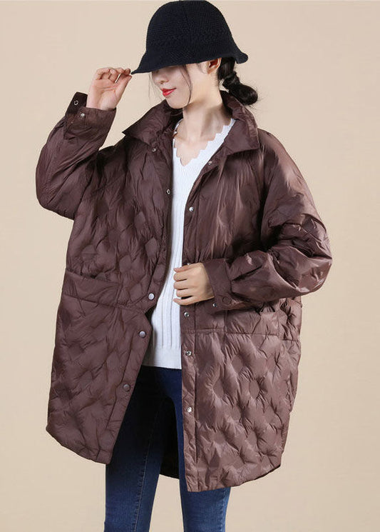 Chocolate Stand Collar Button Loose Winter Puffers Long Down Jacket