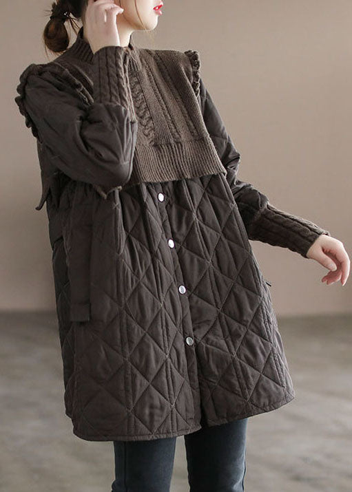 Chocolate Patchwork Fine Cotton Filled Coats Stand Collar Ruffled Winter
