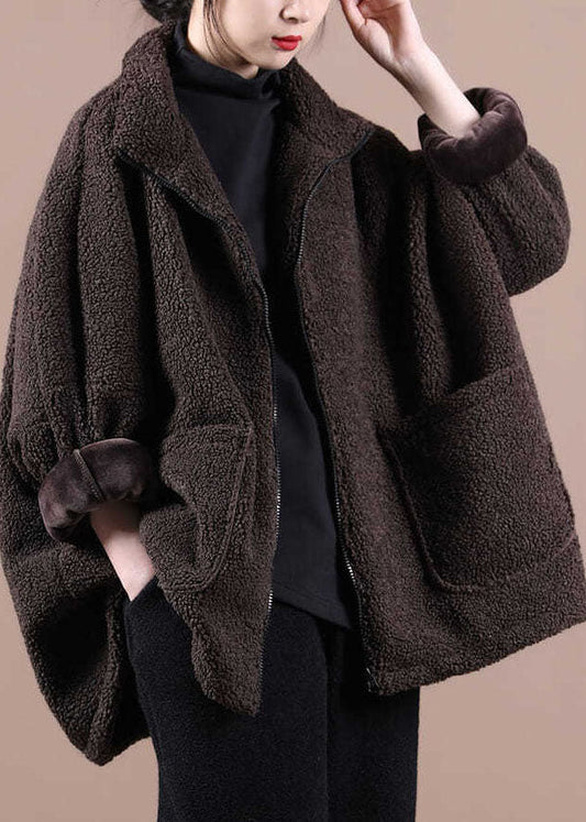 Chocolate Warm Teddy Faux Fur Loose Coats Zip Up Solid Batwing Sleeve