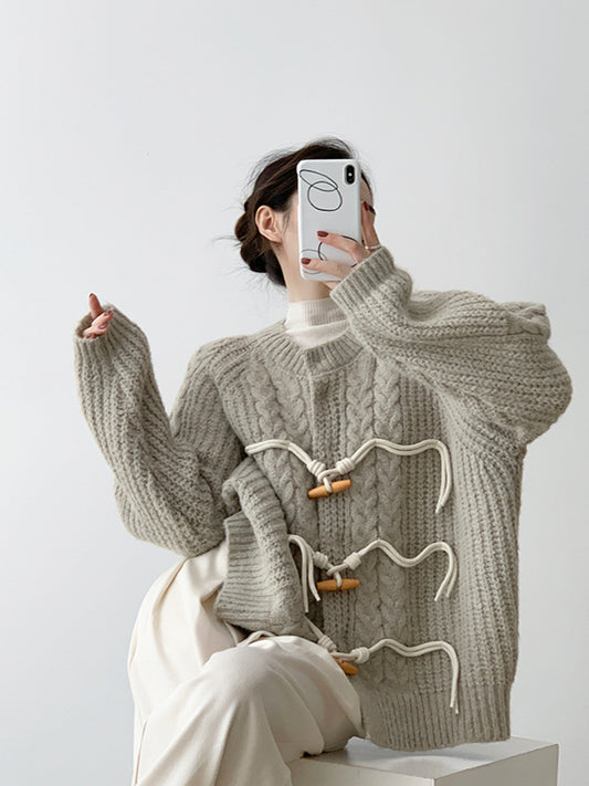Chunky Knit Horn Button Twisted Cardigan in Grey-Green Tones for Women Autumn Winter Sweater