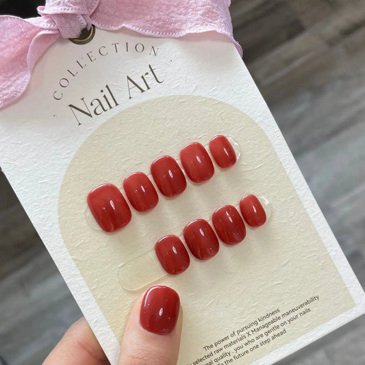 Short Press On nails Handmade Acrylic Full Cover Professional Japanese Nail Sticker Sweet Artificial Red Color Round Head Nails